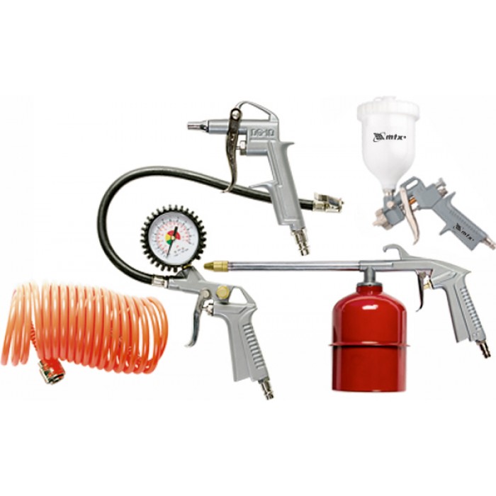 Універсальний набір виготовлений з високоякісного матеріалу. Використовується для фарбувальних, промивки, продувки робіт, а також для підкачки шин. Застосовується як в побутових (гаражі, домашні майстерні), так і в професійних (автосервіси, меблеве виробництво, дрібні фасадні роботи) умовах. Підходить до всіх видів пневматичних компресорів. Має в комплекті шланг довжиною 5 метрів з коннектором для швидкоз'ємного з'єднання.