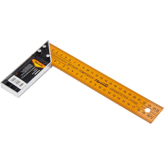 Металевий кутник з пофарбованою поверхнею і двосторонньої розміткою полотна. Полотно кутника має двосторонню розмітку. Призначений для розмітки і перевірки прямих кутів, а також для перевірки кута 45 градусів при обробці і складанні виробів.