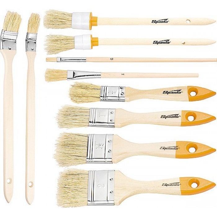Кисті виготовлені з натуральної світлої щетини і мають дерев'яну ручку. Комплект арт. 84111 - кисті плоскі 1 лютого, 3 4, 1. Комплект арт. 84113 - кисті плоскі 3, 4, 1, 1,5, кисть кругла №2. Комплект арт. 84114 - кисті плоскі 3, 4, 1, 1,5, кисті круглі №2, №4, кисть для масляної фарби №1. Комплект арт. 84115 - кисті плоскі 3, 4, 1, 1,5, кисті круглі №2, №4, кисті радіаторні 1, 1,5, пензлі для масляної фарби №2, №6.