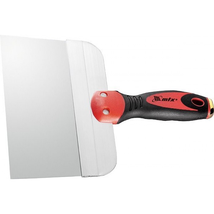 Полотно шпателя виготовлено з нержавіючої сталі. Двокомпонентна (пластик + гума) ручка не прослизає в руці. Ручка шпателя має спеціальну (вигнуту) форму, що забезпечує максимально зручну роботу. Шпатель призначений для нанесення шпаклівок і штукатурних розчинів при вирівнюванні великих поверхонь.