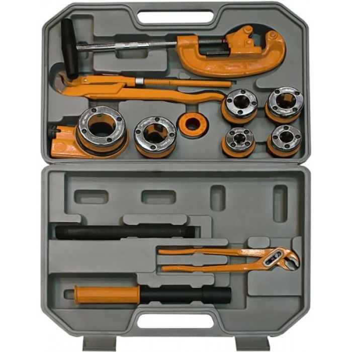Комплектуючі набору виготовлені з якісної високовуглецевої інструментальної сталі. У комплектацію входять клупи, тримач, 2 трубних ключа, Труборіз і ФУМ-стрічка. Набір упакований в зручний пластмасовий кейс.