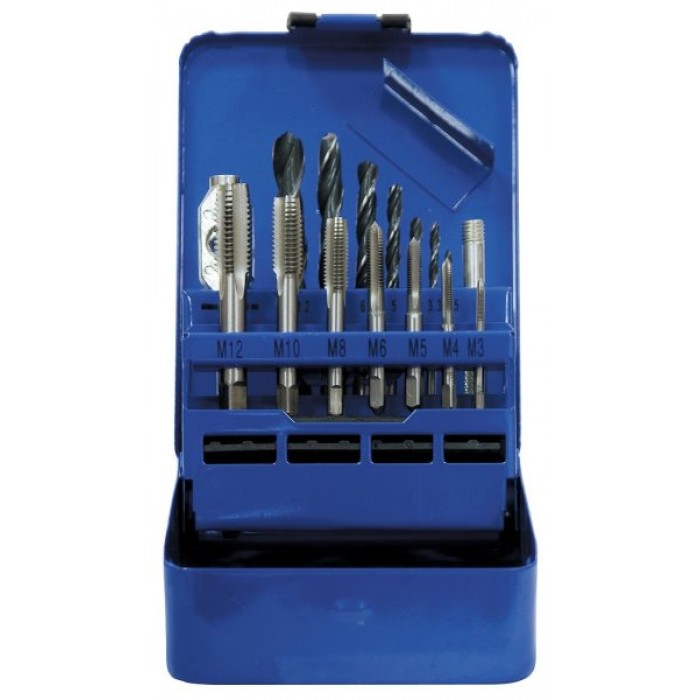 У комплект для нарізування внутрішньої різьби входять свердла 2,5-3,3-4,2-5,0-6,8-8,5-10,2 мм, мітчики М3 х 0,5, М4 х 0,7, М5 х 0,8, М6 х 1,0, М8 х 1,25, М10 х 1,5, М12 х 1,75, Метчикоутримувачі. Набір упакований в зручну металеву коробку.
