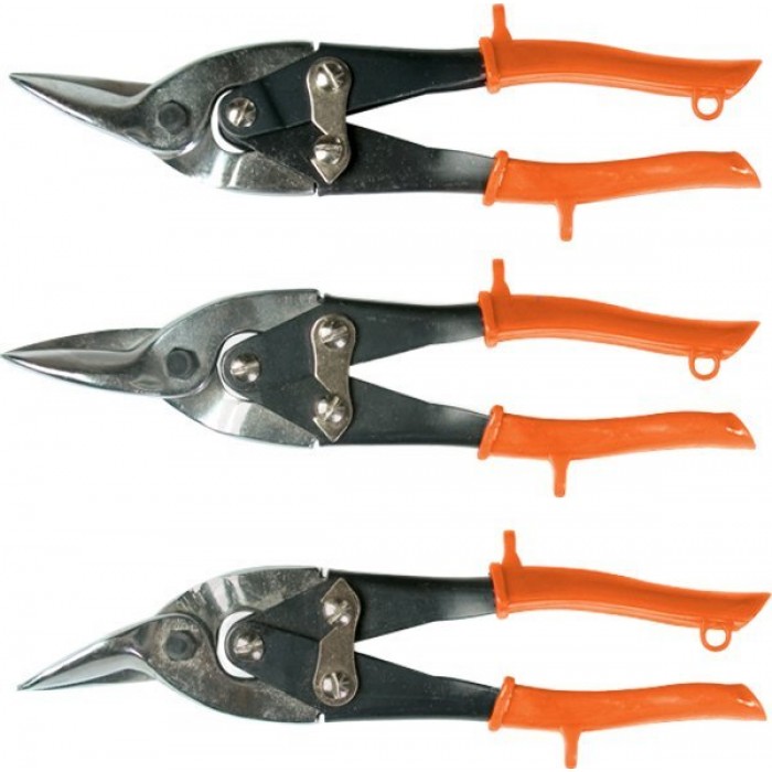 Ножиці по металу з двохважелем системою для полегшення різу. Набір містить ножиці для різання листового металу трьох типів: 1 - прямого прохідного правого різу, 2 - прямого прохідного лівого різу, 3 - прямого різу.
