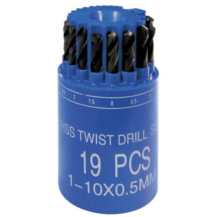У набір входять свердла з 1.0-10.00 мм (через 0.5 мм). Свердла по металу виготовлені з швидкорізальної сталі (HSS). Мають високу стійкість до зношування і зламу. Призначені для свердління отворів різних діаметрів в листовому металі. Для зручності і зберігання упаковані в пластиковий стакан-пенал.