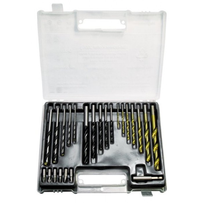 Набір свердел комбінований призначений для побутового використання. У набір входять найбільш поширені розміри свердел і біт. Свердла по бетону з вуглецевої сталі з твердосплавної пластиною з матеріалу марки ВК8. Свердла по металу зі швидкорізальної сталі (HSS). Свердла по дереву з вуглецевої сталі. Біти з хромованадіевой сталі. Інструменти упаковані в пластмасовий пенал.