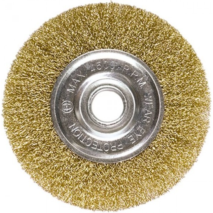 Щітка виготовлена із сталевого дроту. Латунне покриття. Застосовується для очищення металевих поверхонь від іржі та бруду в щадному режимі. Тип посадки - М14.