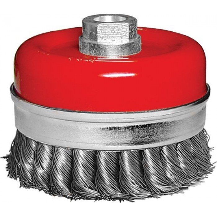 Щітка виготовлена з крученої сталевого дроту. Застосовується для грубого очищення металевих поверхонь від іржі і зачистки зварних швів. Тип посадки - М14.