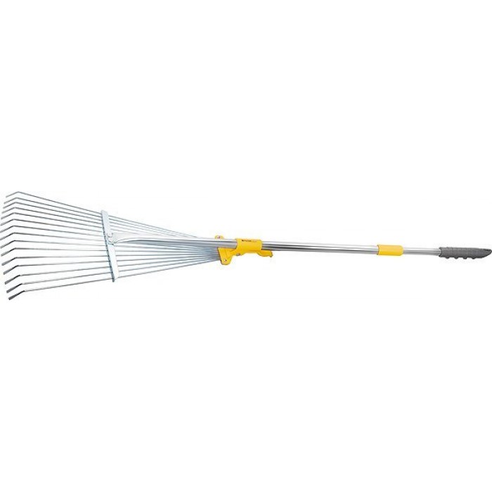 Граблі віялові регульовані, 15 круглих, сплюснутих на кінцях зубців, охоплення робочої частини від 190 до 550 мм. Алюмінієвий телескопічний держак з двухкомпонентной ручкою на кінці. Довжина держака змінюється в діапазоні 500 мм. Зуби закріплені на рухомій, ковзної по черешку втулці, яка фіксується ексцентриковим затискачем в будь-якому положенні, змінюючи ширину захвату. Призначені для збору опалого листя, зрізаних гілок, бур'янів, садового сміття. Круглі жорсткі зуби дозволяють використовувати граблі для аерації грунту. Зуби виконані з пружинного стали 65Г і мають підвищену жорсткість, що забезпечує зручність у роботі. Оцинковка зубів захищає від корозії.