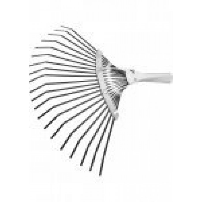 Граблі віялові посилені, 20 плоских зубів, охоплення робочої частини 400 мм. Тулейка внутрішнім діаметром 25 мм. Розташована зверху распорка підсилює пружний ефект і додатково зміцнює конструкцію. Призначені для збору опалого листя, зрізаних гілок, бур'янів, садового сміття. Зуби виконані з пружинного стали 65Г і мають підвищену жорсткість, що забезпечує зручність в роботі. Оксидування зубів захищає від корозії.