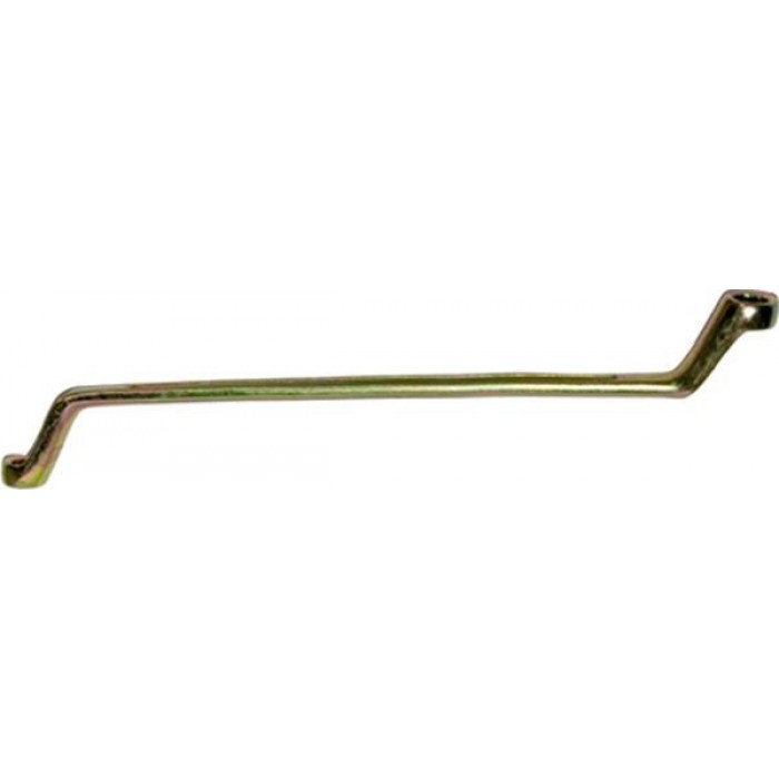 Ключ гайковий колінчастий має два кільцевих зіву різних розмірів. Профіль кільцевого зіву має 12 граней, що збільшує площу зіткнення робочих поверхонь і знижує ризик деформації граней кріплення при монтажі. Накидні робочі частини ключа зміщені щодо його рукоятки, що дозволяє працювати у важкодоступних місцях. Виготовлений з вуглецевої сталі. Твердість матеріалу робочої частини ключа 42 HRc (вимоги ГОСТ - 41-46 HRc). Ключ має антикорозійне покриття з жовтого цинку. Ключ гайковий колінчастий призначений для монтажу демонтажу різьбових з'єднань.