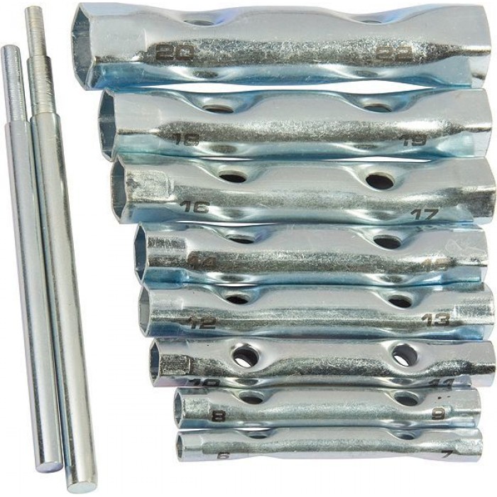 Ключі торцеві двосторонні. Тонкі стінки ключів-трубок дозволяють здійснювати монтаж у важкодоступних місцях, коли болтові з'єднання розміщені в значних заглибленнях. У набір арт. 13752 входить 8 ключів (6 & ndash; 22 мм) і 2 воротка. У набір арт. 13740 входить 5 ключів (8 & ndash; 17 мм) і 1 комірець. Виготовлені з вуглецевої сталі. Твердість матеріалу робочої частини ключа & ndash; 41 HRc, що відповідає вимогам ГОСТу. Ключі мають захисне покриття з цинку. Набір упакований в блістер.