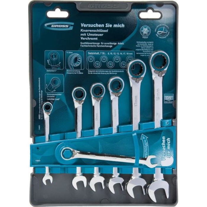 Набір комбінованих ключів торгової марки GROSS призначений для монтажу / демонтажу різьбових з'єднань. Ключі набору виготовлені з високоякісної хромованадіевой (Crv) стали. У набір входить сім ключів розміром від 8 до 19 мм. Кожен ключ з одного боку оснащений захопленням відкритого типу & mdash; ріжковим і накидним (кільцевих) на шарнірі з іншого боку. Сторона з накидним типом захоплення обладнана храповим механізмом, який дозволяє проводити швидкий монтаж різьбових з'єднань. хромонікелевим покриття ключів покращує антикорозійні властивості інструменту. Упакований набір в термоформованную плівкову коробку (double blister).