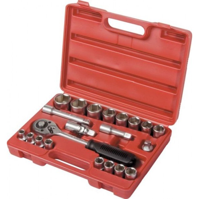 У набір входять інструменти під квадрат 12: ключ трещеточний (45 зубів) з ергономічною 2-кольоровою ручкою, реверсом і механізмом розблокування кулькового фіксатора, головки торцеві 6-гранні & ndash; 16 шт. (10, 11, 12, 13, 14, 15, 16, 17, 18, 19, 21, 22, 24, 27, 30 і 32 мм)